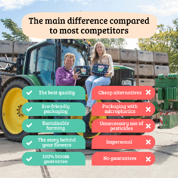 Bringen Sie Farbe und Eleganz in Ihren Garten mit den 15 Tulpenzwiebeln Zartrosa. Diese wunderschönen Tulpen mit ihren zarten rosa Blütenblättern sind eine wahre Bereicherung für jeden Gartenliebhaber, der auf der Suche nach einem Hauch von Raffinesse und Romantik ist. Die Tulpenzwiebeln werden in einer umweltfreundlichen, nachhaltigen Verpackung geliefert, die nicht nur zur Schönheit Ihres Gartens beiträgt, sondern auch zum Erhalt unseres Planeten.