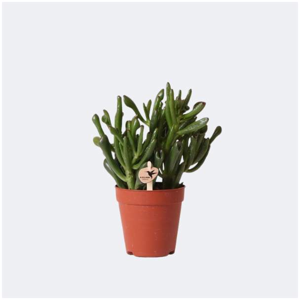 Die Crassula ‘Hobbit’ ist eine besondere und dekorative Sukkulente mit auffälligen, röhrenförmigen Blättern, die ihr ein verspieltes und eigenwilliges Aussehen verleihen. Die glänzend grünen Blätter mit manchmal einem roten Rand machen diese Sukkulente zu einem echten Blickfang. Dank ihres kompakten Wuchses ist sie perfekt für die Fensterbank, den Schreibtisch oder als Teil einer Pflanzenkomposition.