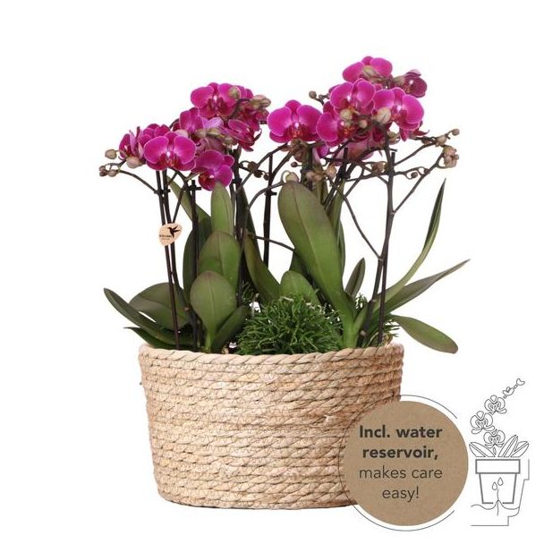 Schöne Pflanzenset, 3 Schmetterlingsorchideen Morelia, Ø9cm, Farbe Lila, + 3 grüne Pflanzen Ø6cm in Schilfrohrkorb inkl. Wasserreservoir, 35cm hoch – Phalaenopsis orchidee | ↕35 cm