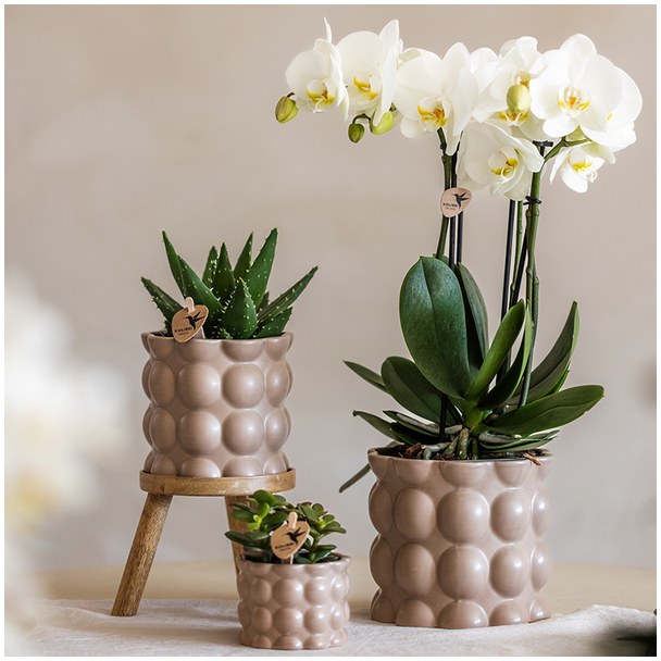 Schöne Pflanzenset Baumwolle Sand, bestehend aus weißer Schmetterlingsorchidee Gent Ø12cm, grünen Pflanzen in Topfgröße 9cm und Topfgröße 6cm, Holz-Pflanzenständer, blühende Zimmerpflanze