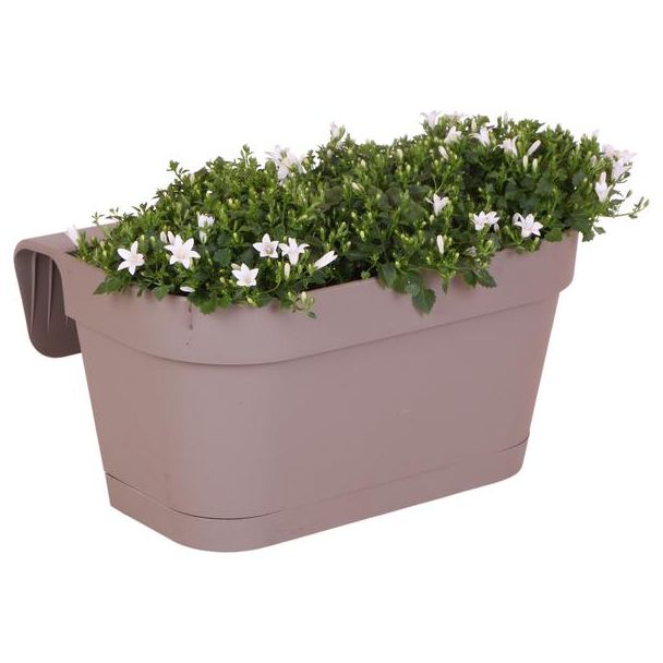 Mit diesem taupefarbenen Balkonkästen, gefüllt mit 3 weißen Campanula Addenda Ambella, verleihst du deinem Balkon oder deiner Sichtschutzwand ein strahlendes Aussehen. Die Kombination aus dem taupefarbenen Balkonkasten und den weißen Campanula-Pflanzen setzt einen eleganten Akzent in deinem Außenbereich. Mit ihrem klassischen oder verspielten Erscheinungsbild sind die Addenda Campanula vielleicht die dankbarsten Pflanzen, die du dir vorstellen kannst. Der Balkonkasten ist mit einem Wasserreservoir ausgestattet, das das Wasser auffängt, um ein Auslaufen zu verhindern. Dank des praktischen Befestigungssystems kann der Balkonkasten sicher und ordentlich an jedem Balkonhandlauf angebracht werden, mit dem richtigen Abstand. Der Balkonkasten passt auf ein Geländer mit einer Breite von bis zu 6 cm. Die 3 dazugehörigen weißen Addenda Campanula haben einen Topfdurchmesser von 12 cm, sodass der Balkonkasten komplett gefüllt ist. Mit einer Breite von 36 cm passt der Balkonkasten perfekt auf deinen Balkon. Das Einzige, was du noch tun musst, ist, die Pflanzen umzutopfen, und dann kannst du sofort diese komplette Balkonbepflanzung genießen.