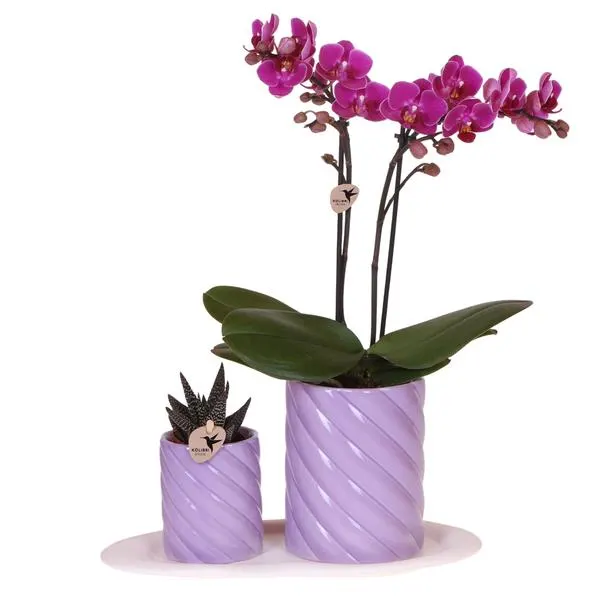 Geschenkset klein lila, Orange Orchidee Morelia Ø9cm, Grüne Sukkulente Ø6cm, Süße Dekotöpfe, Weißes organisches Tablett
