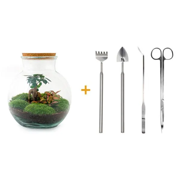 Glas Pflanzgefäß! - Teddy Bonsai - ↕ 26,5 cm - DIY - mit Rechen, Schaufel, Pinzette und Schere