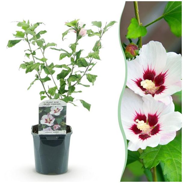 Der Hibiscus syriacus ‘Hamabo’ ist ein eleganter, reichblühender Strauch mit großen, hellrosa Blüten und einem auffälligen roten Zentrum. Diese laubabwerfende Gartenpflanze blüht üppig im Sommer und verleiht Ihrem Garten eine sanfte, exotische Ausstrahlung. Dank seiner pflegeleichten Eigenschaften ist dieser Hibiskus perfekt für Beete, als Solitär oder in einer Hecke geeignet.