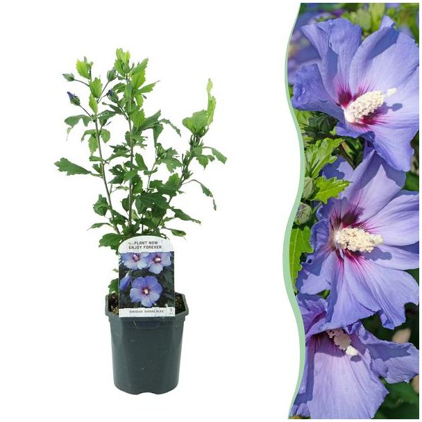 Hibiscus syriacus ‘Oiseau Blue’ ist ein wunderschöner, reichblühender Strauch mit auffälligen blau-lila Blüten und einem dunklen Zentrum. Diese laubabwerfende Gartenpflanze blüht üppig im Sommer und sorgt für eine einzigartige und stilvolle Ausstrahlung im Garten. Dank ihrer pflegeleichten Eigenschaften ist dieser Hibiskus ideal für Beete, als Solitär oder in einer Hecke.