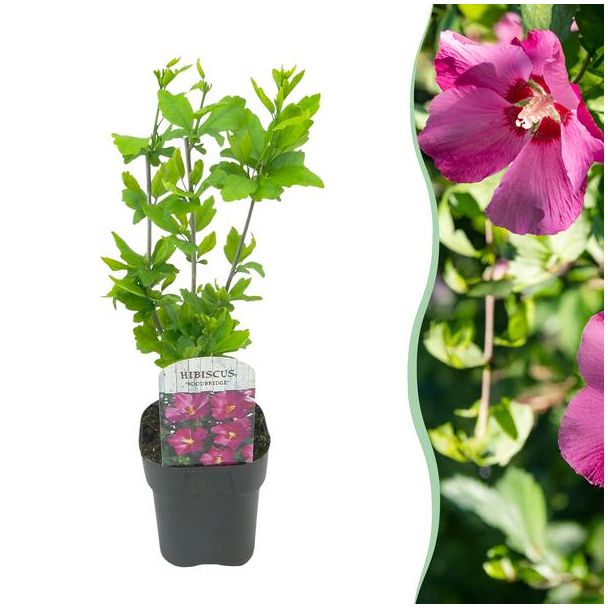 Hibiscus syriacus ‘Woodbridge’ ist ein wunderschöner, reichblühender Strauch mit auffälligen rosa Blüten und einem dunklen Zentrum. Diese laubabwerfende Gartenpflanze blüht im Sommer üppig und bringt Farbe sowie einen exotischen Flair in den Garten. Dank ihres pflegeleichten Charakters ist dieser Hibiskus ideal für Beete, als Solitär oder in einer Hecke.