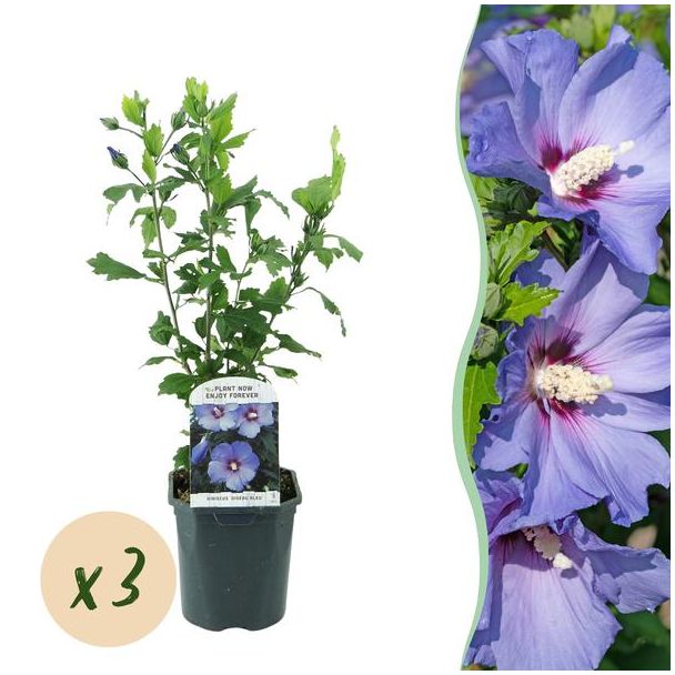 3 Stück Altheasträucher Blau mit dunklem Herzen – Hibiscus syriacus ‘Oiseau Blue’ | ↕45 cm