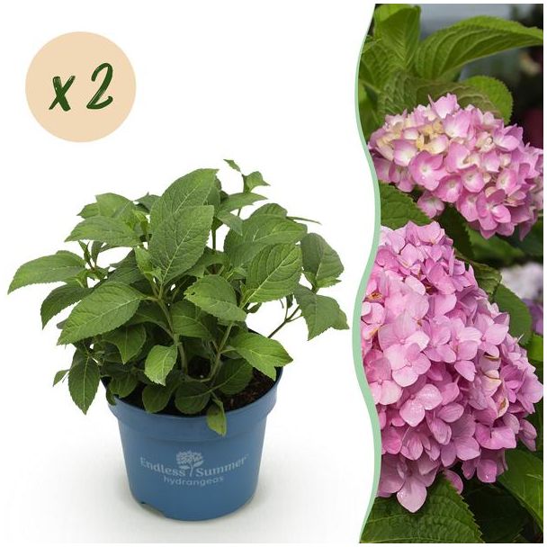Hydrangea Endless Summer The Original Pink ist eine robuste und reichblühende Hortensie mit wunderschönen, kugeligen Blüten in einem sanften Rosaton. Diese winterharte Gartenpflanze blüht sowohl am alten als auch am neuen Holz, sodass Sie besonders lange Freude an einer üppigen Blüte haben. Dieses Set besteht aus 2 Pflanzen und ist ideal für Beete, kleine Gärten oder Töpfe und sorgt für eine stimmungsvolle und farbenfrohe Ausstrahlung.