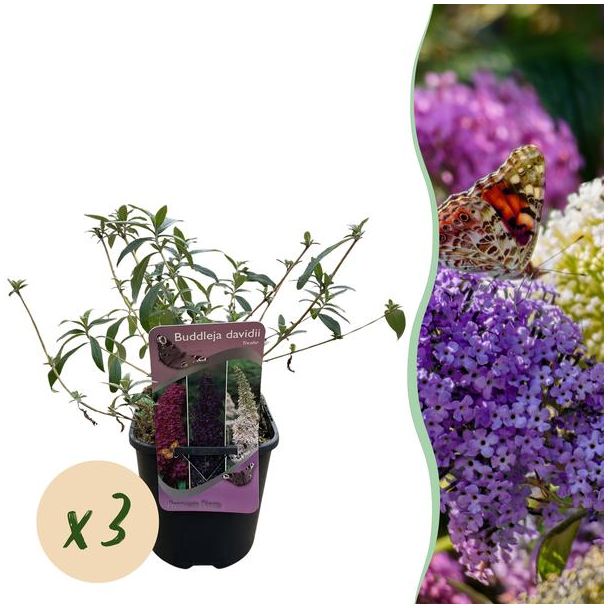 Green boutiQ - Schmetterlingsstrauch - Buddleja davidii Tricolour - Blüte Rosa, Weiß und Lila - 3 Pflanzen - 1m² - Laubabwerfend - Schmetterlingsanziehend - Topf 17cm Höhe 30cm
